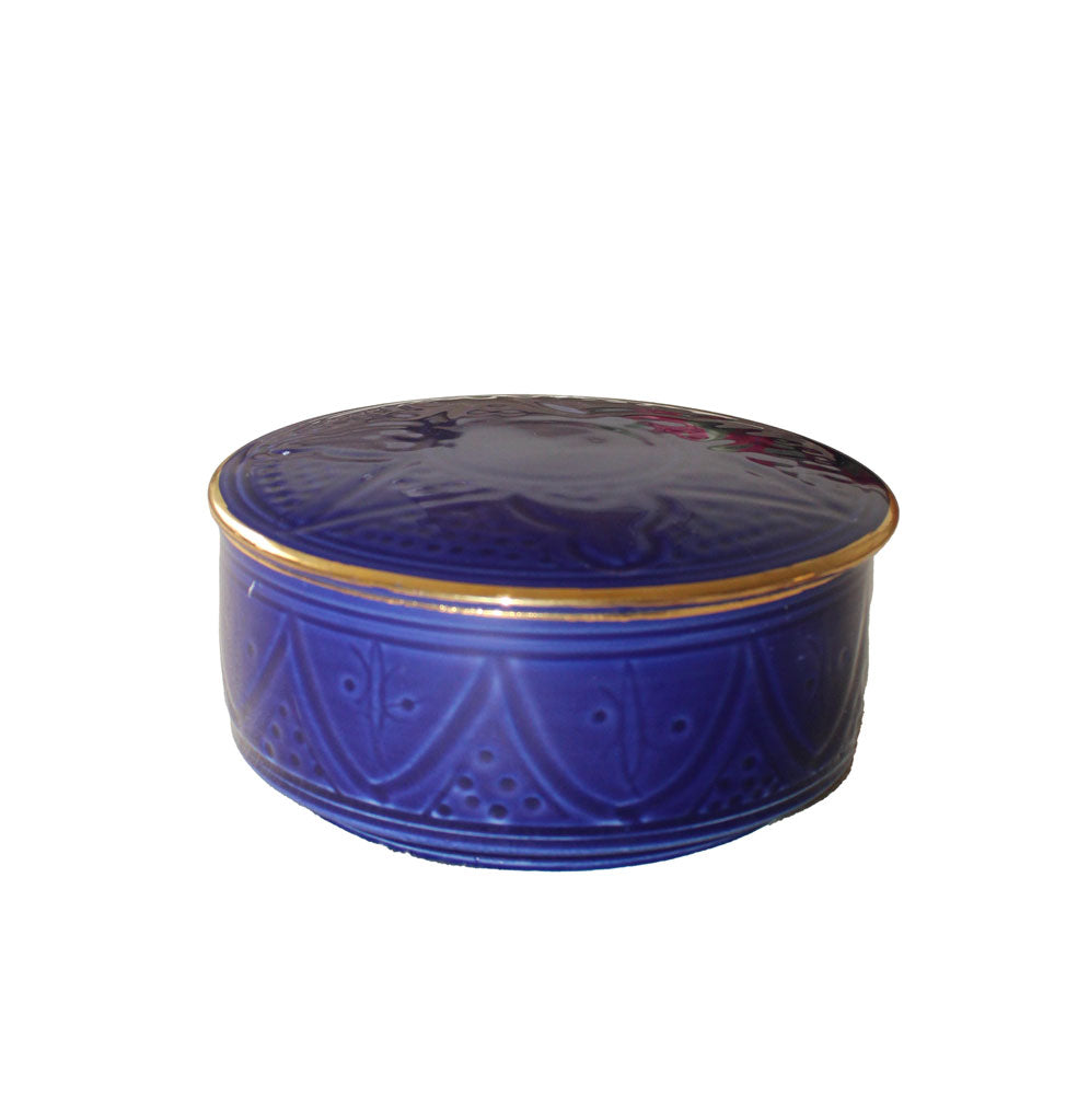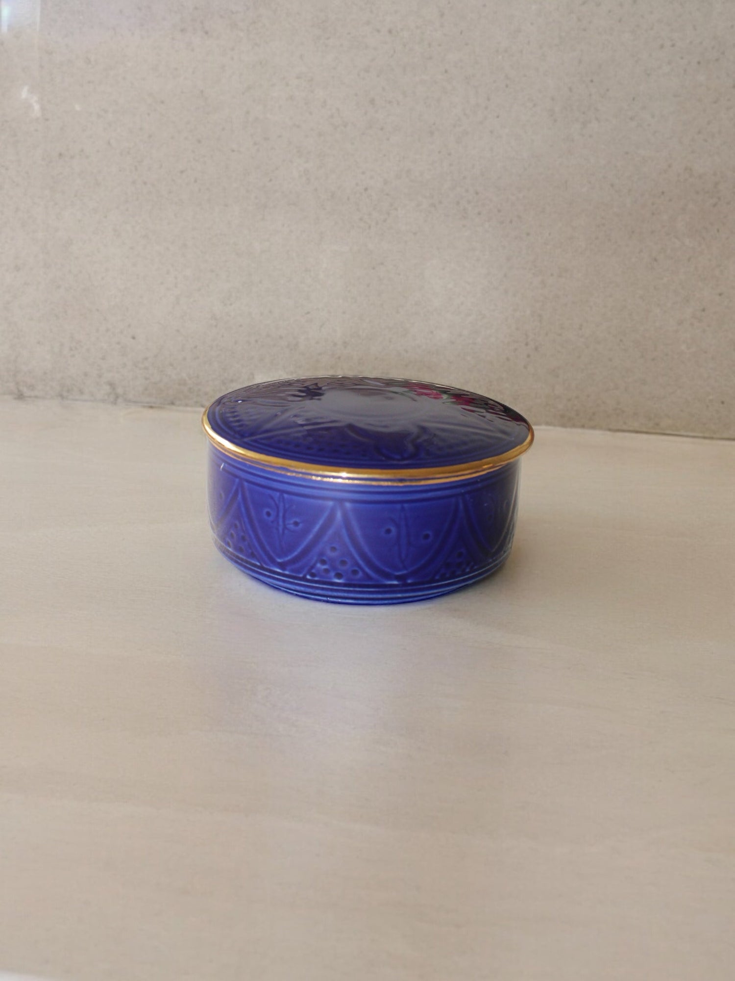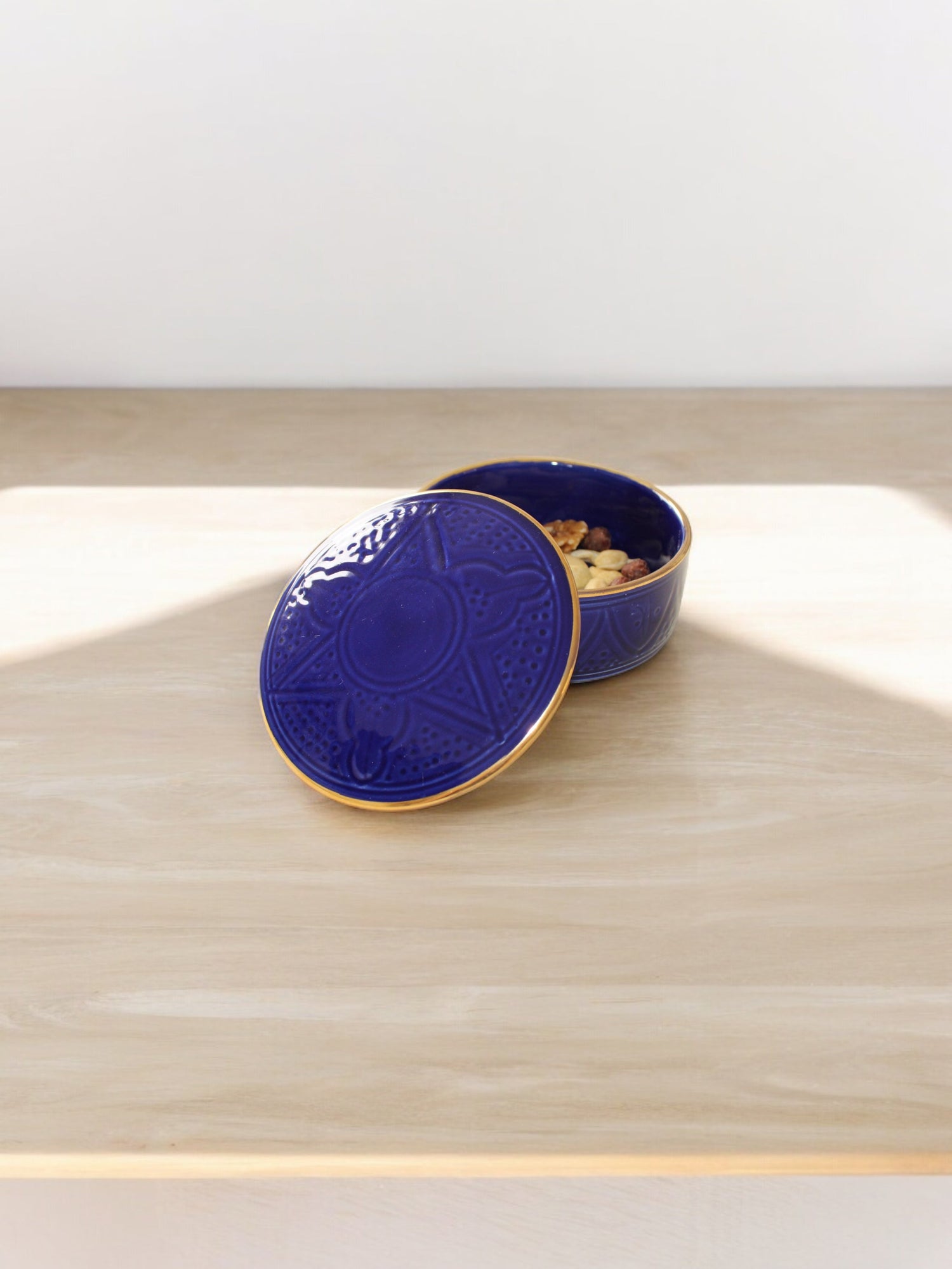 Embellissez votre maison avec notre boîte à fruits secs en céramique bleu Majorelle, dotée d'un couvercle en or 12 carats. Cette création artisanale marocaine est réalisée avec les matières les plus saines, combinant élégance et fonctionnalité. Choisissez cette boîte artisanale pour un ajout décoratif et pratique qui célèbre l'art marocain et l'excellence artisanale.