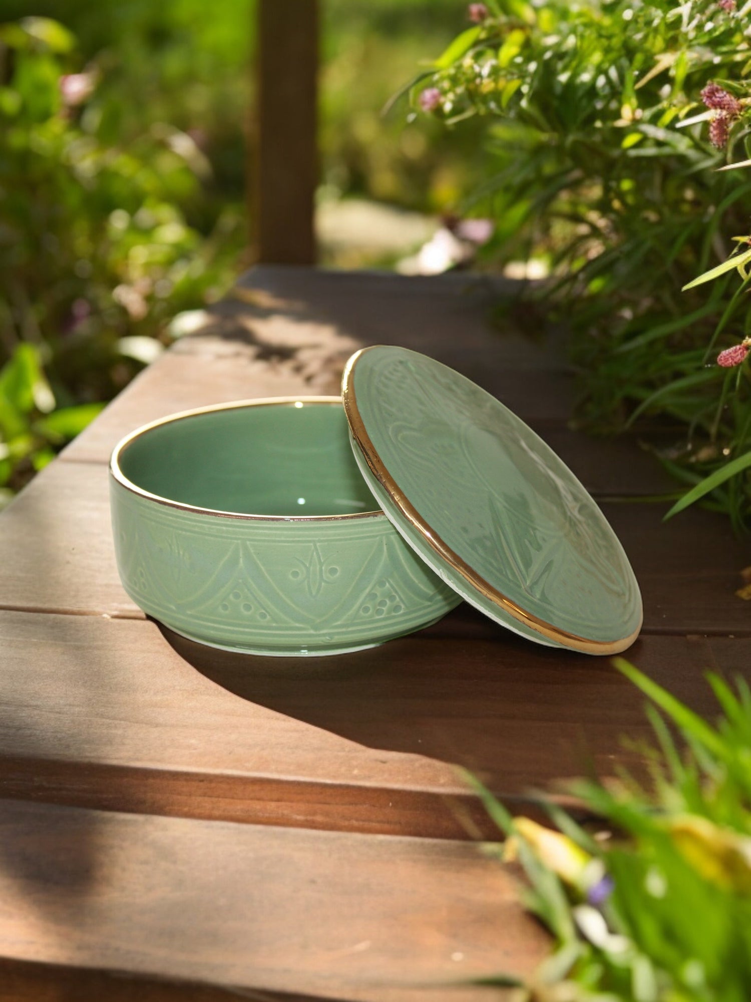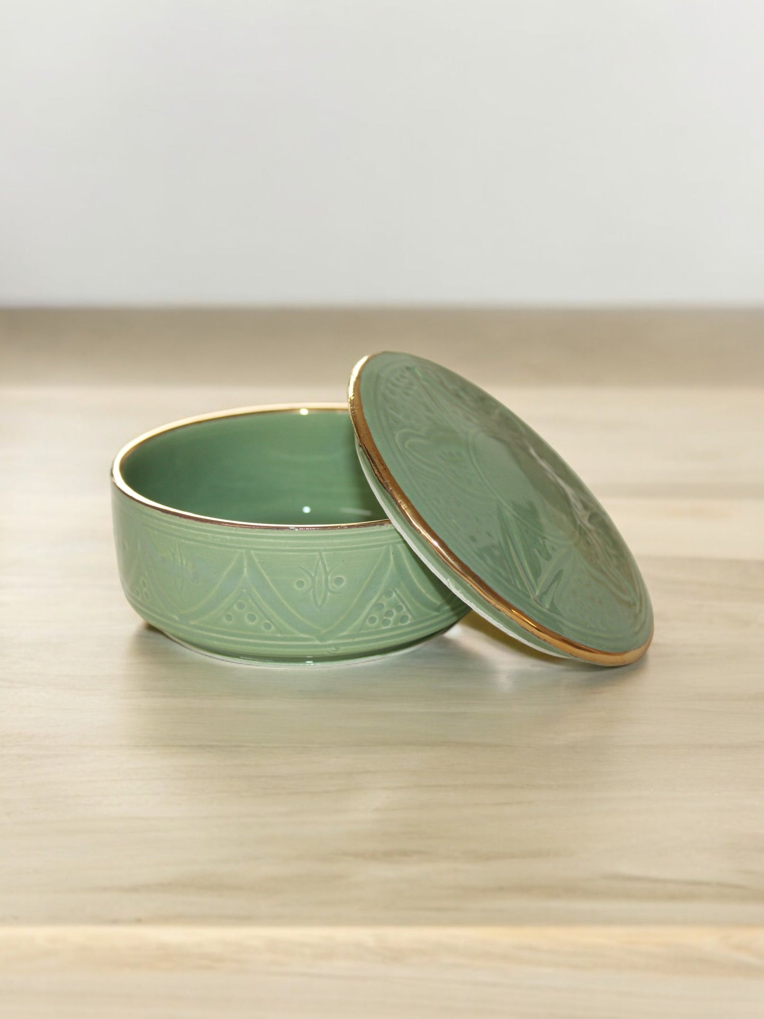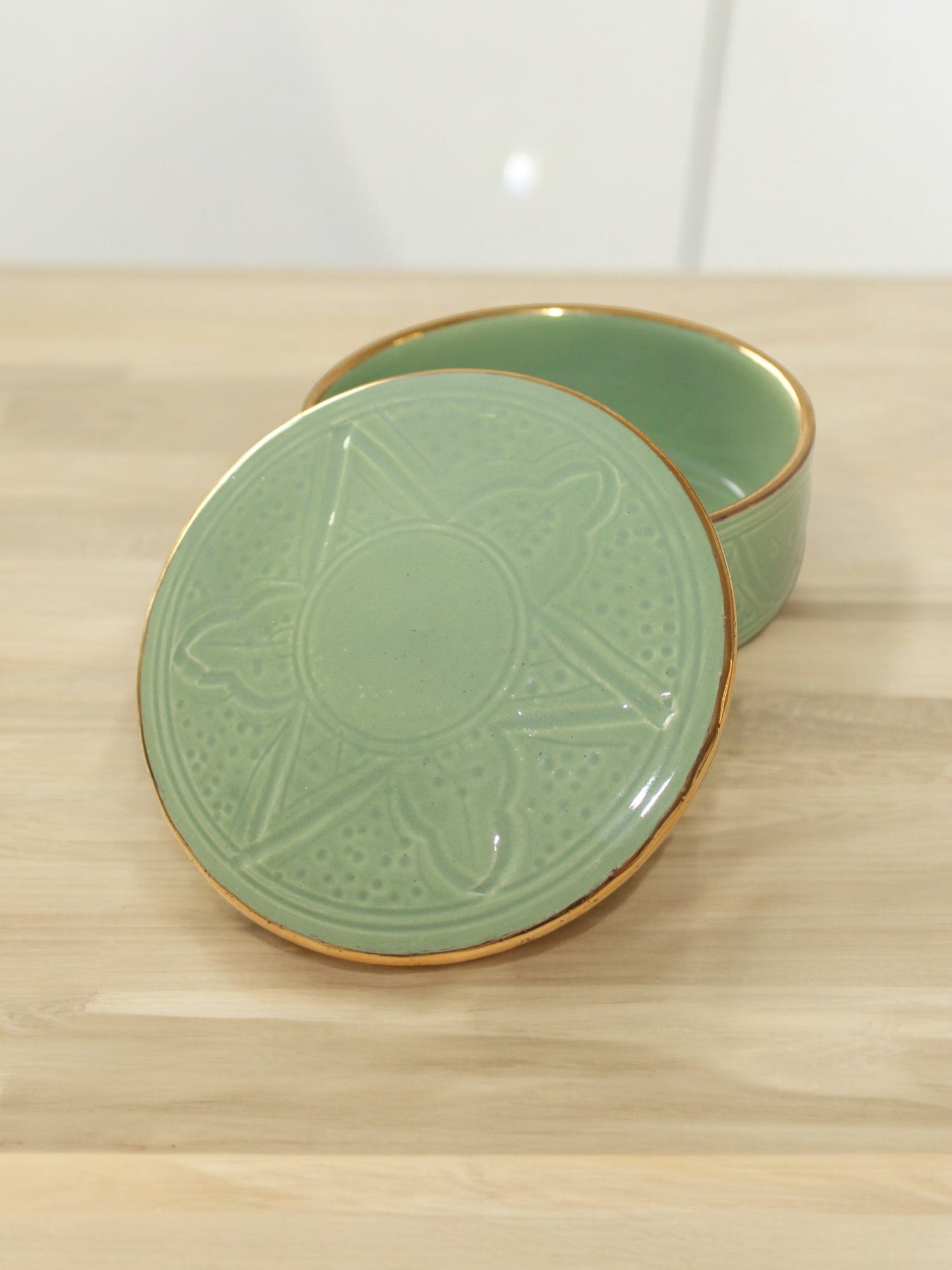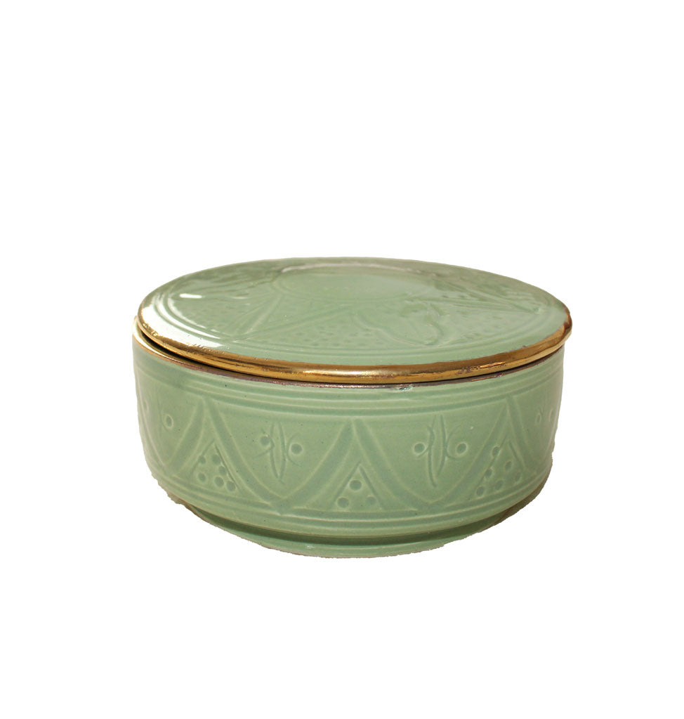 Découvrez notre boîte à fruits secs en céramique vert, ornée d'un couvercle en or 12 carats, fabriquée à la main par des artisans marocains. Utilisant les matières les plus saines, cette pièce raffinée allie luxe et fonctionnalité. Idéale pour ajouter une touche de sophistication à votre maison, elle est parfaite pour conserver vos fruits secs tout en décorant votre intérieur. Un choix écologique et élégant pour ceux qui apprécient l'artisanat traditionnel et le design haut de gamme.