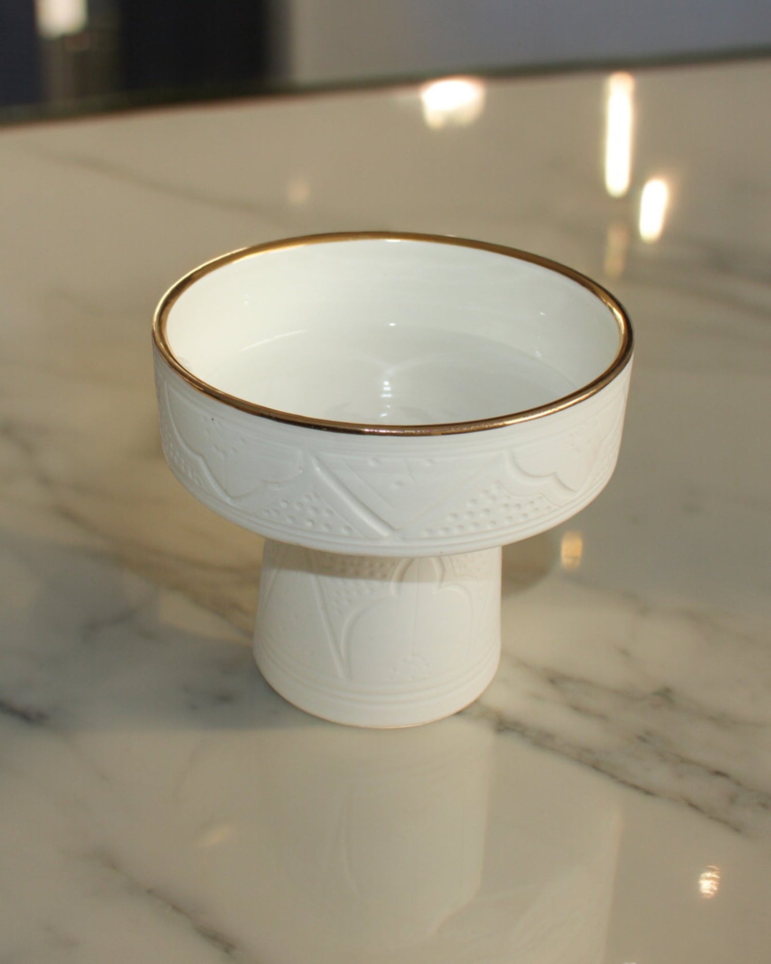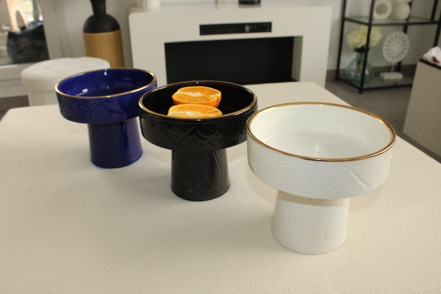 Découvrez la pureté et l'élégance de notre coupe artisanale en céramique blanche, conçue avec une attention méticuleuse aux détails. Chaque pièce est soigneusement façonnée et finie à la main, mettant en valeur un design épuré et contemporain. La bordure de cette coupe est magnifiquement rehaussée d'une délicate finition en or 12 carats, apportant une touche de luxe subtil à l'ensemble. Parfaite pour une décoration intérieure moderne et sophistiquée, cette coupe d'exception se distingue par son esthétique intemporelle. Elle incarne l'harmonie parfaite entre le savoir-faire artisanal et un design raffiné, ajoutant une touche de prestige et de sophistication à n'importe quel espace.