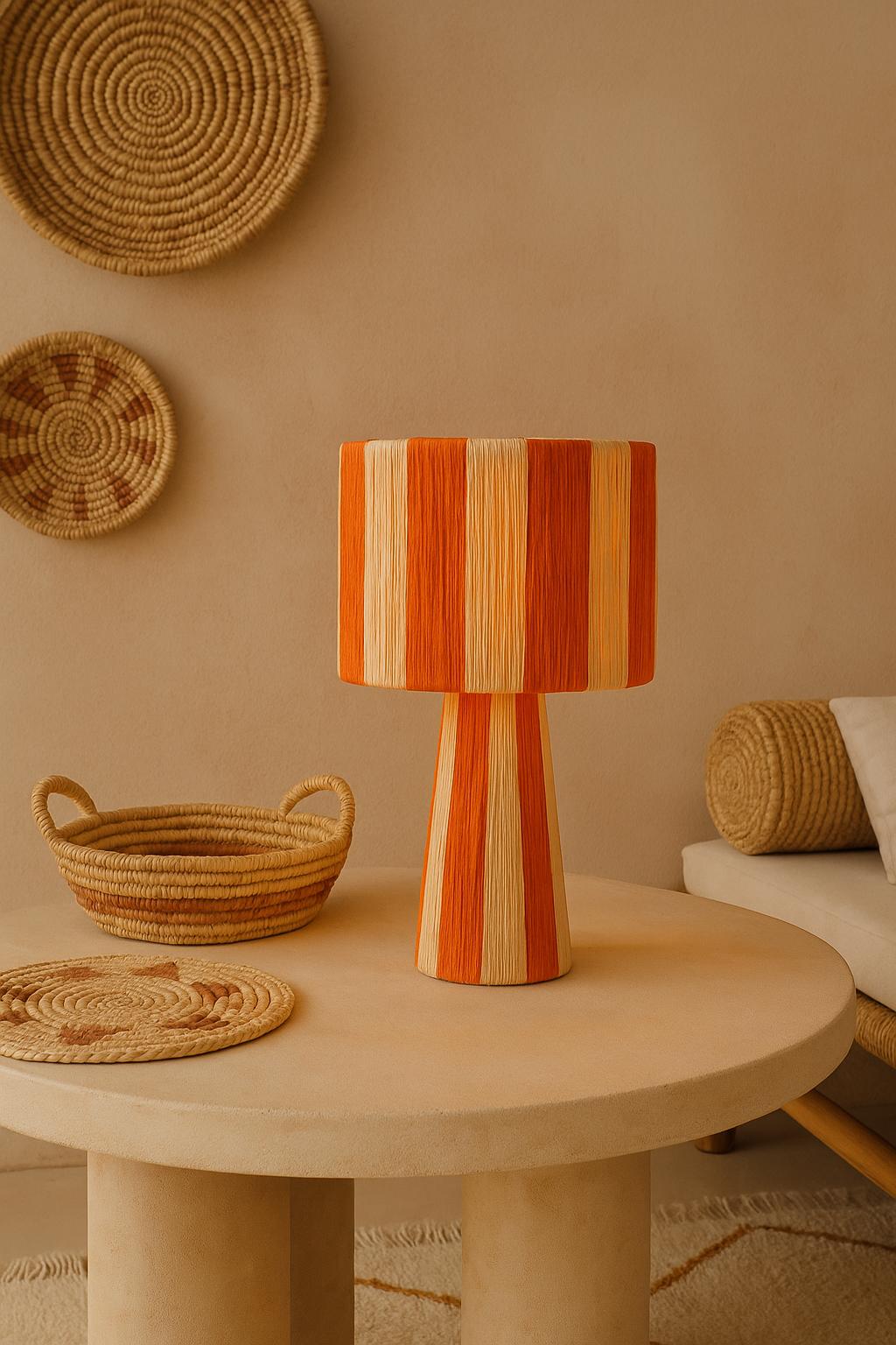 La lampe Ambre allie la chaleur du raphia naturel à une touche subtile d’orange, insufflant une note solaire et joyeuse dans votre intérieur. Entièrement fabriquée à la main au Maroc, cette pièce singulière marie artisanat traditionnel et design contemporain.