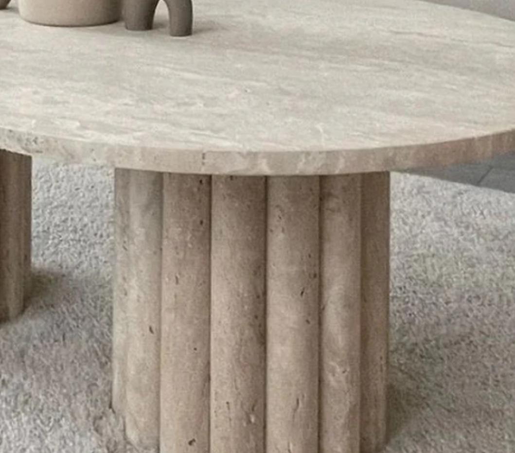 Avec son plateau en travertin naturel aux veinures chaleureuses et ses deux pieds striés massifs , la table basse Menzeh impose sa présence tout en subtilité. Son design graphique et structuré évoque une architecture minérale, brute mais raffinée, qui s'intègre aussi bien dans un intérieur contemporain que dans un décor plus classique.