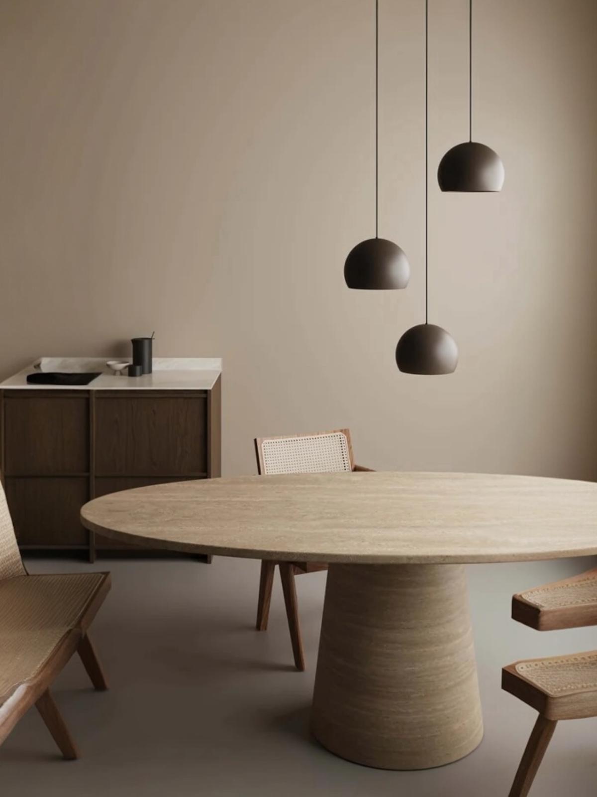 La table à manger Orion séduit par son grand plateau rond en travertin naturel et son pied cylindrique massif, poli avec soin. Sa silhouette épurée et lisse évoque la perfection des formes géométriques, tout en mettant en valeur la noblesse de la pierre.
