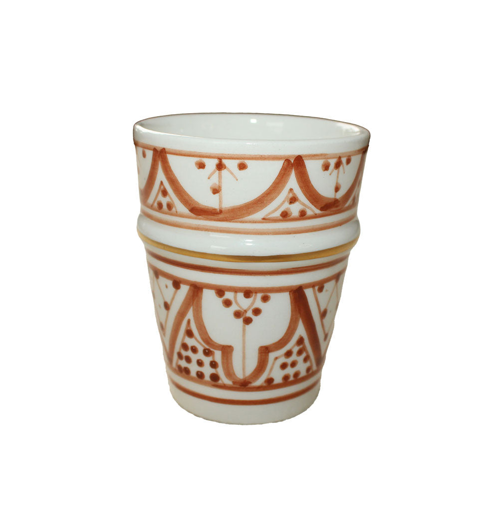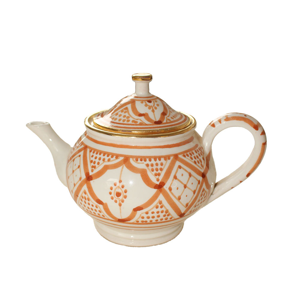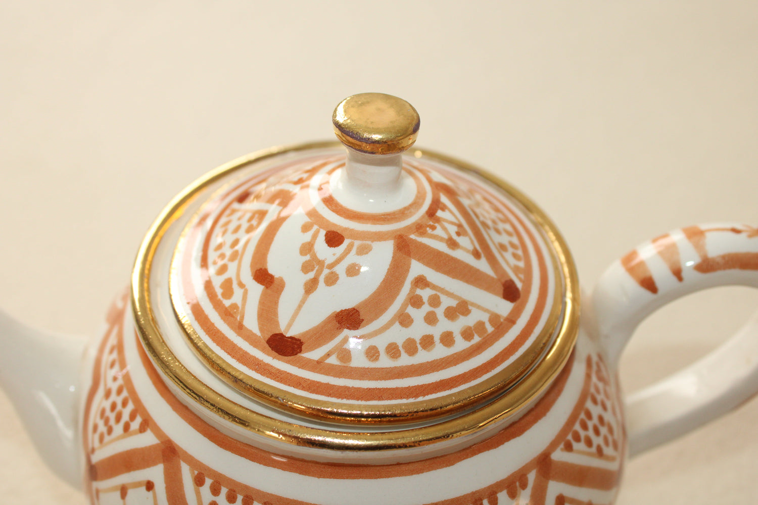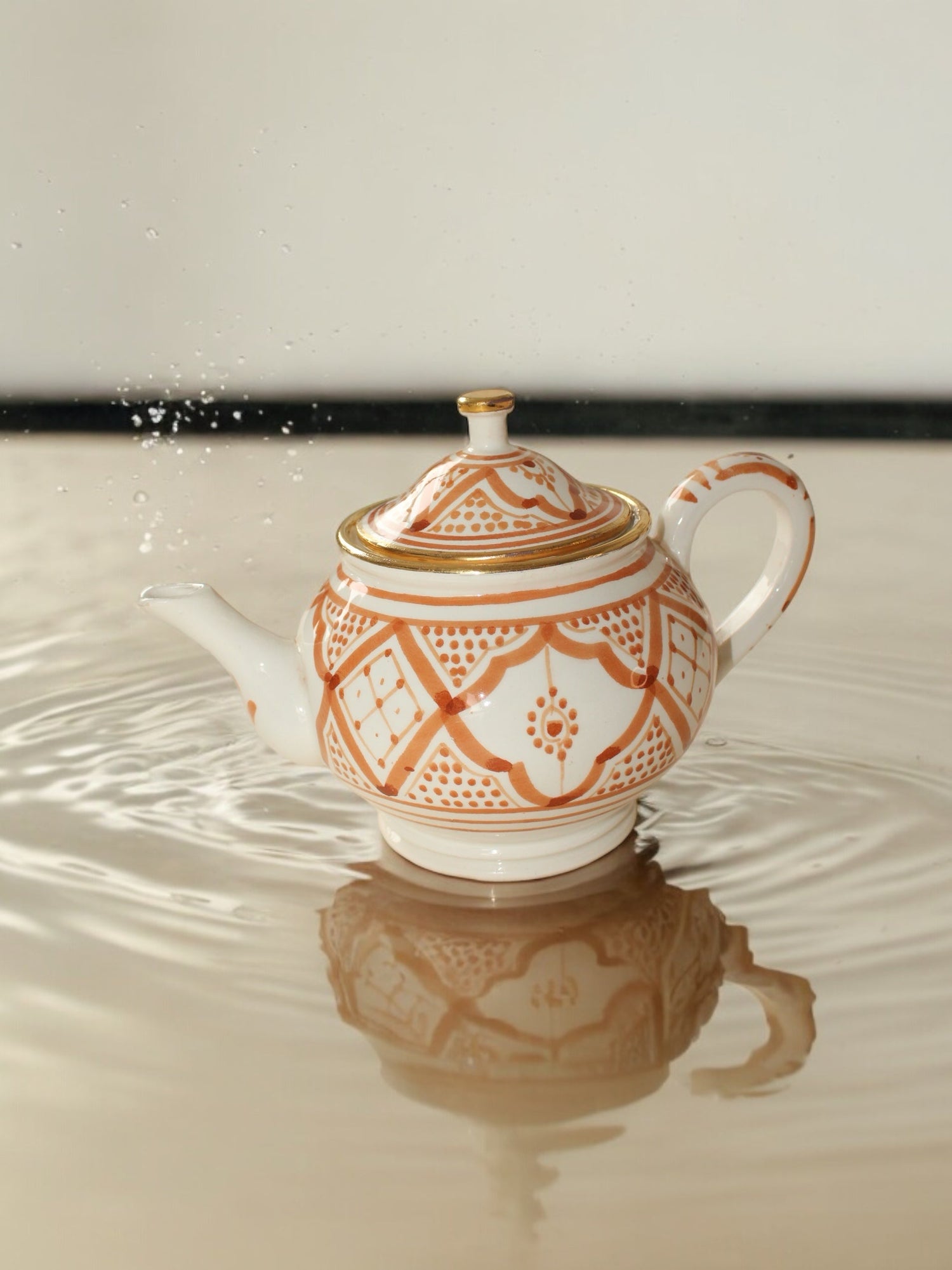 Transformez vos moments de convivialité avec notre élégant service à thé en céramique, composé d'une théière et de trois verres assortis, chacun rehaussé d'un liseré en or 12 carats. Fabriqué à la main par des artisans marocains, ce service marie parfaitement tradition et luxe moderne. La théière, ornée de motifs beldi, et les verres, délicatement décorés, apportent une touche de raffinement et d'élégance à votre table. Confectionné à partir de matériaux naturels et écologiques, ce service à thé unique incarne l'authenticité du savoir-faire artisanal marocain tout en offrant un design sophistiqué. Idéal pour recevoir vos invités avec style, il ajoute une note de charme et de luxe à chaque dégustation.