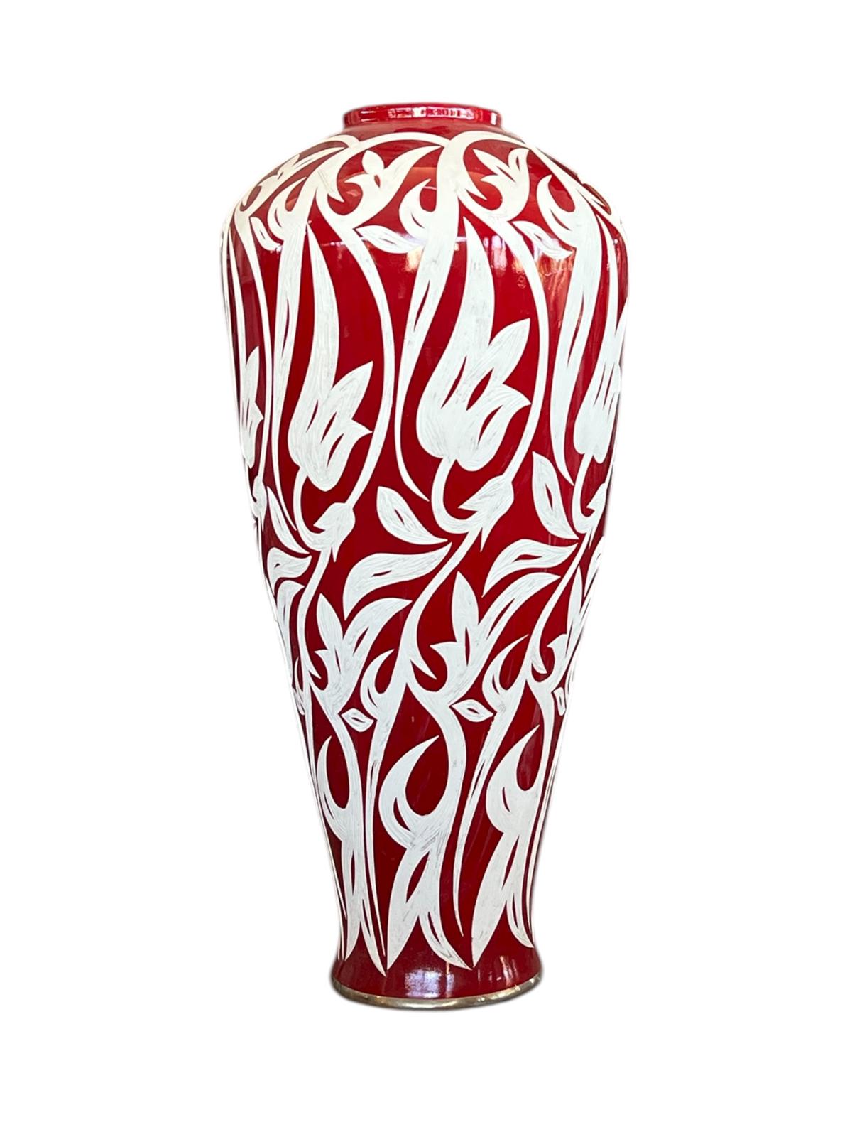 Ses motifs gravés, peints dans un rouge profond contrasté par la blancheur naturelle de la céramique, créent un jeu visuel saisissant entre intensité et raffinement. Plus qu'un simple objet décoratif, ce vase devient un symbole d'authenticité et de prestige artisanal.