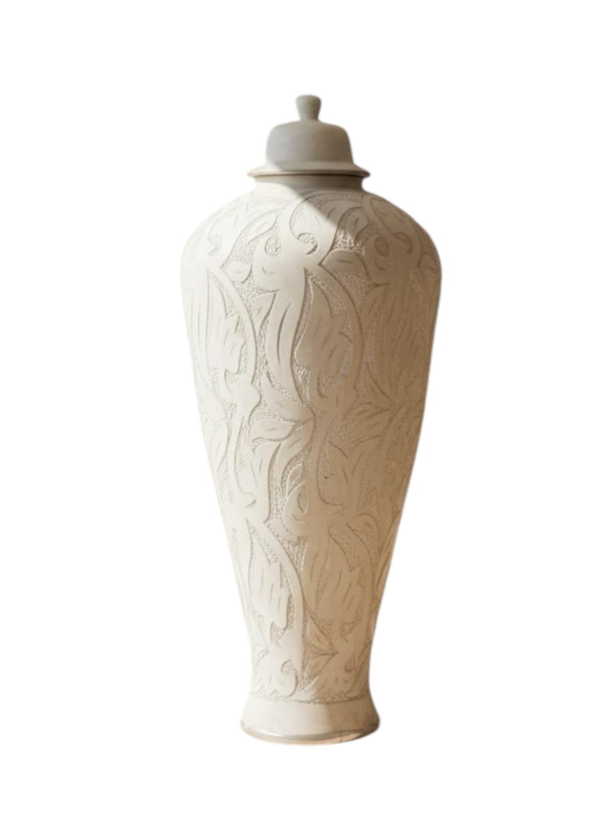 Ses motifs floraux délicatement incrustés dans la céramique confèrent à ce vase un charme raffiné et authentique. Sa teinte naturelle et ses lignes élancées en font un objet d'art qui s'intègre harmonieusement dans un salon spacieux, une entrée lumineuse ou une terrasse élégante.